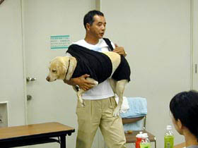 しつけの基本を学んだ後は、犬が病気やケガをした時の救急処置(人工呼吸や脈の取り方)、そして、Tシャツを使っての輸送方法−特に大型犬の場合2枚のTシャツを使って運ぶなどは飼い主が是非知っておきたい内容でした。